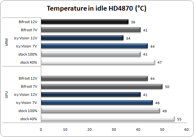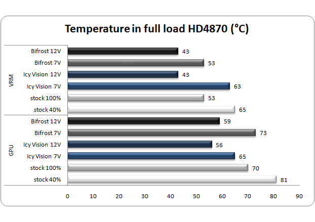 Le temperature sono state confrontate con quelle del dissipatore stock della Powercolor HD4870 PCS+, un cooler OEM prodotto da Zerotherm e con il dissipatore Icy Vision Rev 2.0, prodotto da Gelid Solutions e recensito in questo articolo.