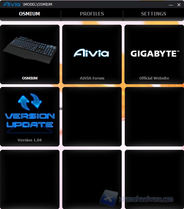 La finestra principale è dedicata alla selezione della periferica Gigabyte desiderata (nel nostro caso è connessa solo la Osmium) ma presenta anche l'accesso al forum Aivia, al sito Gigabyte nonché la ricerca di aggiornamenti software.