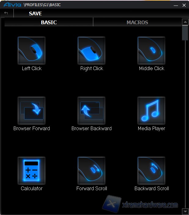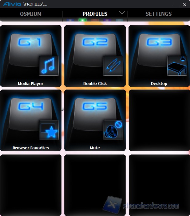 Profili è la tab dedicata alla mappatura dei 5 tasti macro aggiuntivi. Per ogni tasto è possibile selezionare una delle diverse funzioni prestabilite (ad esempio l'avvio del player musicale, il doppio click, back nel browser etc) oppure caricare una macro che si può configurare facilmente mediante il pulsante Edit.